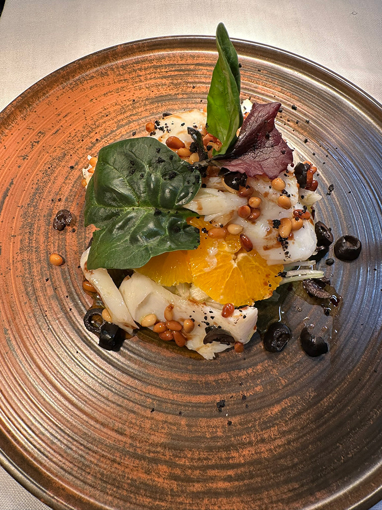 El menú degustación de seis pases propone una experiencia equilibrada que comienza con una gilda sobre asadillo de pimientos acompañada de croqueta de carabineros. A partir de ahí, los sabores evolucionan hacia propuestas frescas y originales como la ensaladilla rusa de mejillones y wakame.